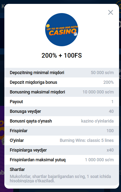 Ba’zan bannerlarda soddalashtirilgan taklif ko‘rinadi: 200% (min. depozit 15 000 so‘m, maksimal 2 500 000 so‘m, veydjer x40, kazino o‘yinlarida). Faol sahifadagi variant — ustuvor.